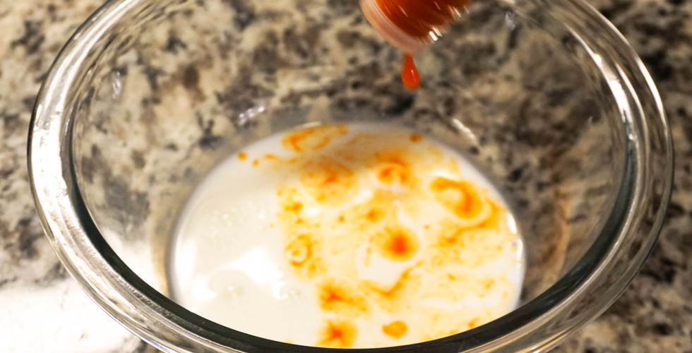 wet batter for your tenders! To make the wet batter you need a medium sized bowl, hot sauces, the seasonings listed above, and then go ahead and mix it all together. Once you have the wet chicken batter seasoned to the T, then you will want to add your seasoned chicken in the bowl.
