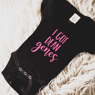 Then Fred and I personally made her some custom onesies to match Miss P. and the rest of the family perfectly! I made the I got it from my mama and I got Dean genes cause they go perfectly with her momma and then I made the last one to incorporate their pups in too! I had sooo much fun making all of these onesies and I cannot wait to see Miss P. in each of them. Thank you to Miss P's parents for supporting my #SmallBusiness, its truly appreciated! Hope y'all enjoy!